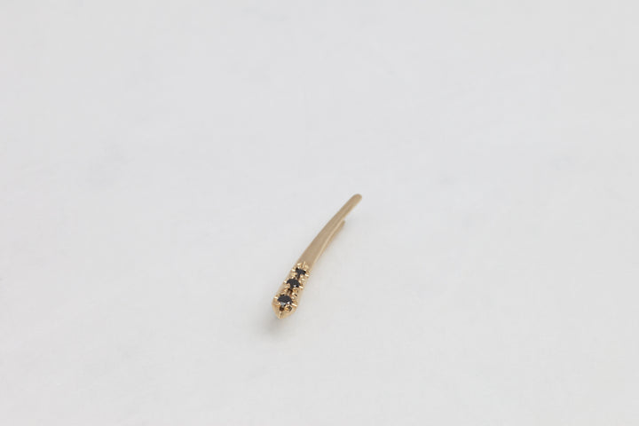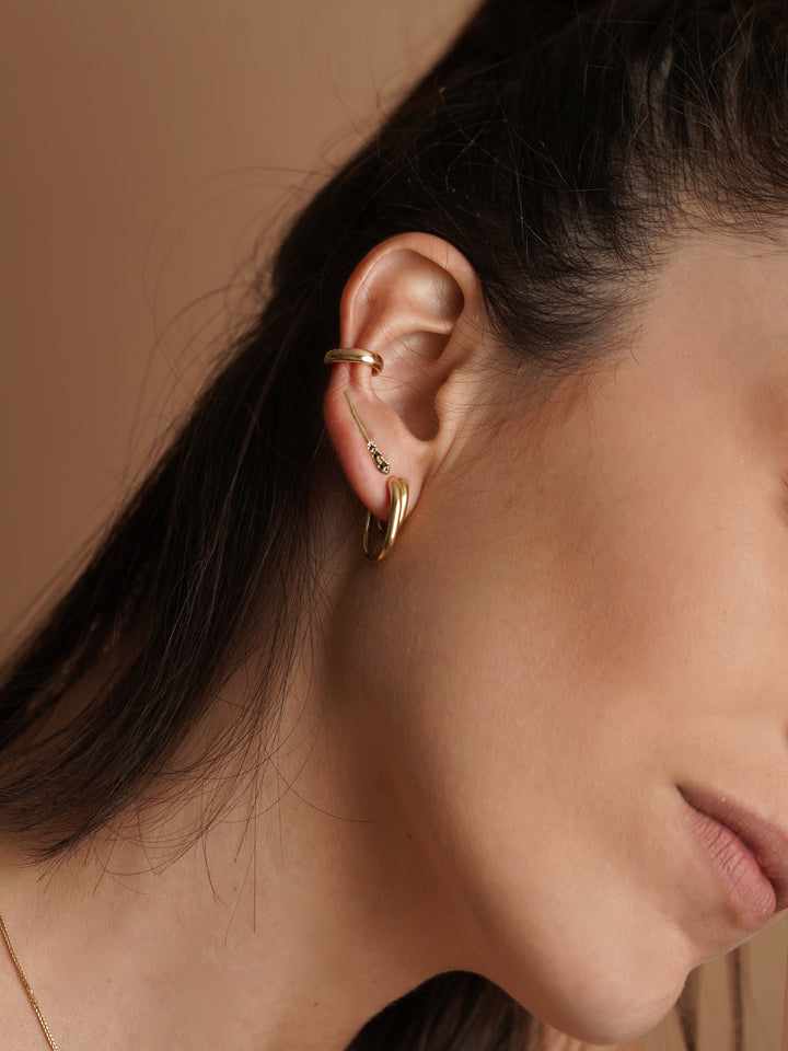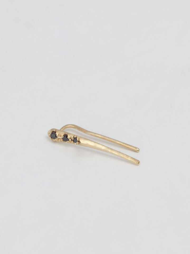 עגיל מטפס מעוצב ללא סוגר אחורי, בעל מוט אחורי בזווית של 90 מעלות, הנענד לאורך גב האוזן על ידי מתח.