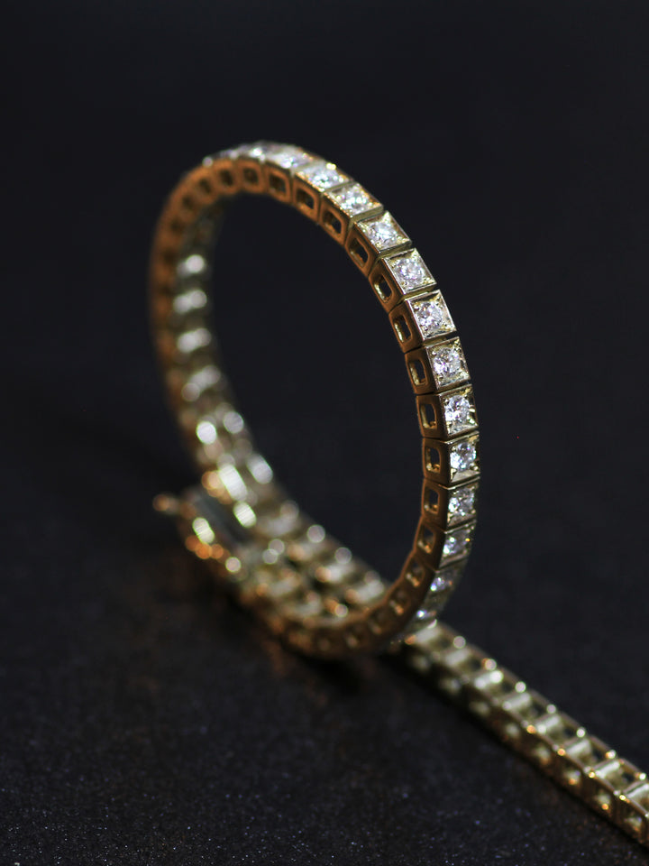 A luxury Tennis bracelet, with a Chocolate type inlay, consists of flexible gold & diamond cubes.